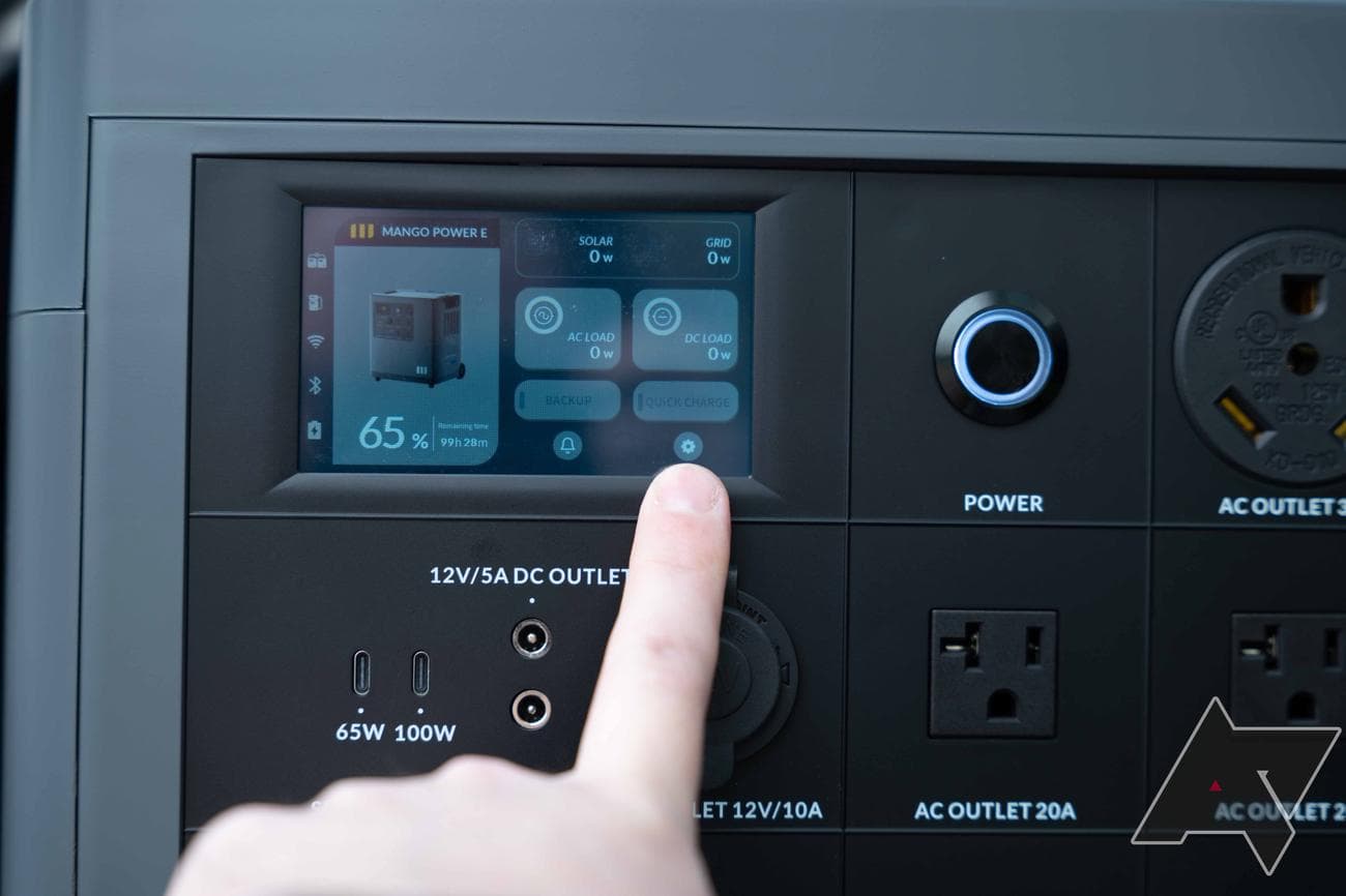 Το επιχειρηματικό τέλος του Mango Power E είναι ένα πλέγμα θυρών, πριζών και οθόνης. Ενώ βασίζεστε σε αυτήν την οθόνη αφής για να ενεργοποιήσετε την τροφοδοσία εναλλασσόμενου ρεύματος και συνεχούς ρεύματος και να ρυθμίσετε χειροκίνητα την ένταση επαναφόρτισης AC, είναι πολύ μεγάλη και αποκρίνεται. Στα δεξιά της οθόνης βρίσκεται το κουμπί λειτουργίας, το οποίο πρέπει να κρατήσετε πατημένο για ένα ολόκληρο δευτερόλεπτο για να το ενεργοποιήσετε και περίπου πέντε για να το απενεργοποιήσετε ξανά. Η στρογγυλοποίηση της επάνω σειράς εδραιώνει το Power E ως ένα σοβαρό κομμάτι υλικού: η πρίζα RV 30A.