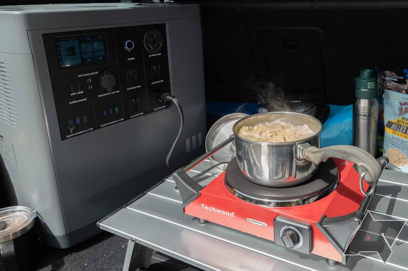 των καιρών. Τράβηξα 45 λεπτά βίντεο με την κάμερά μου και ένα φως στούντιο LED 60W προσδέθηκε στο Power E και κατάφερα να εξαντλήσει μόνο ένα ασήμαντο 2% της χωρητικότητας. Ακόμη και το μαγείρεμα με ηλεκτρική κουζίνα, ένας από τους πιο γρήγορους τρόπους αποστράγγισης ενός σταθμού παραγωγής ηλεκτρικού ρεύματος, είναι τσιμπημένο.