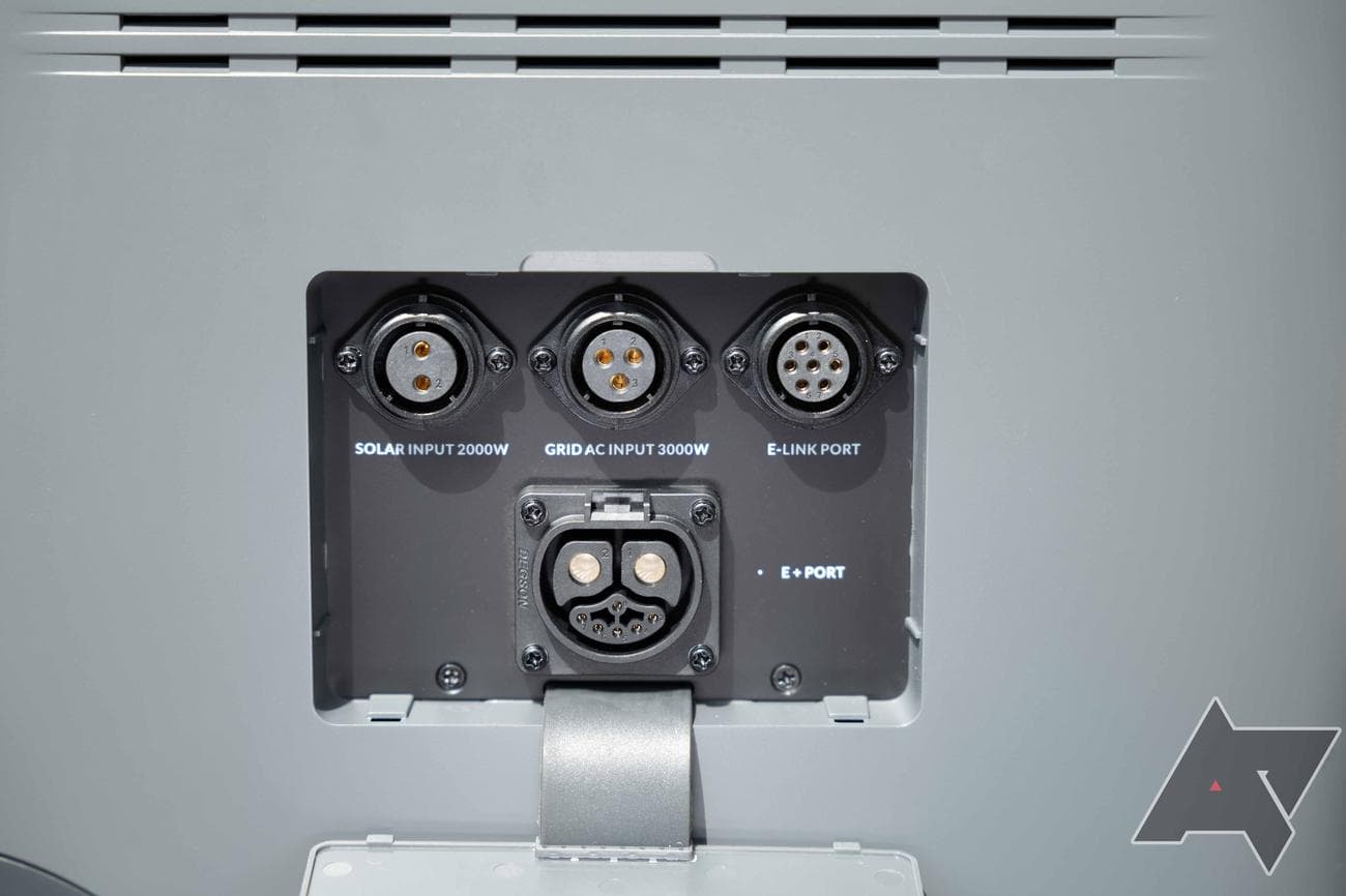 Όλες οι θύρες φόρτισης βρίσκονται πίσω από ένα πάνελ σε μία από τις πιο λεπτές πλευρές του Power E. Ενώ αυτά τα βύσματα επιτρέπουν την ηλιακή ενέργεια DC, την τροφοδοσία τοίχου εναλλασσόμενου ρεύματος, ακόμη και τη φόρτιση EV, η τέταρτη θύρα εδώ είναι για τον διπλασιασμό της χωρητικότητας του Power E από 3,5 KWh έως 7KWh με πρόσθετη μπαταρία.