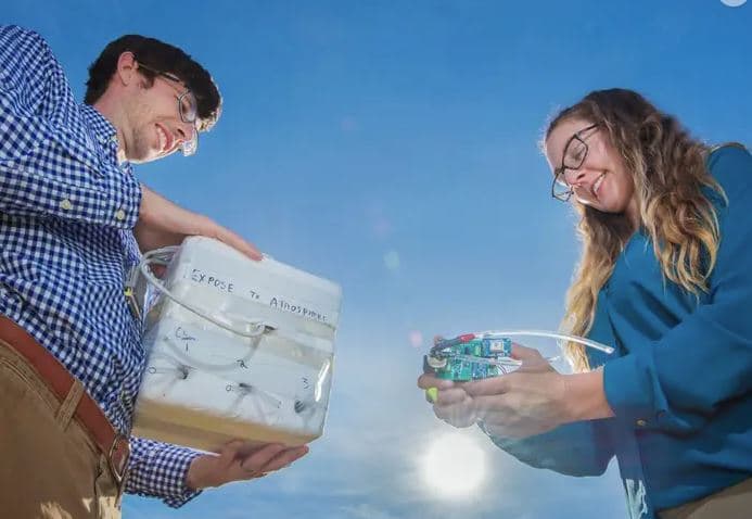 Ο Ντάνι Μπόουμαν και η συνεργάτιδά του Σάρα Άλμπερτ δείχνουν τον αισθητήρα υπόηχων που χρησιμοποιούν στα αερόστατα (Randy Montoya)