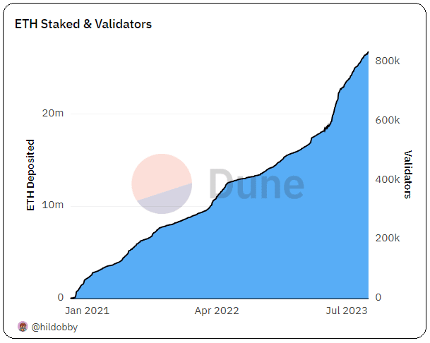Σύμφωνα με την ιστοσελίδα dune.com, το 22,27% της συνολικής κυκλοφορίας βρίσκεται σε staking. Όπως παρατηρούμε στο διάγραμμα, οι validators έχουν φτάσει τους 836.574.