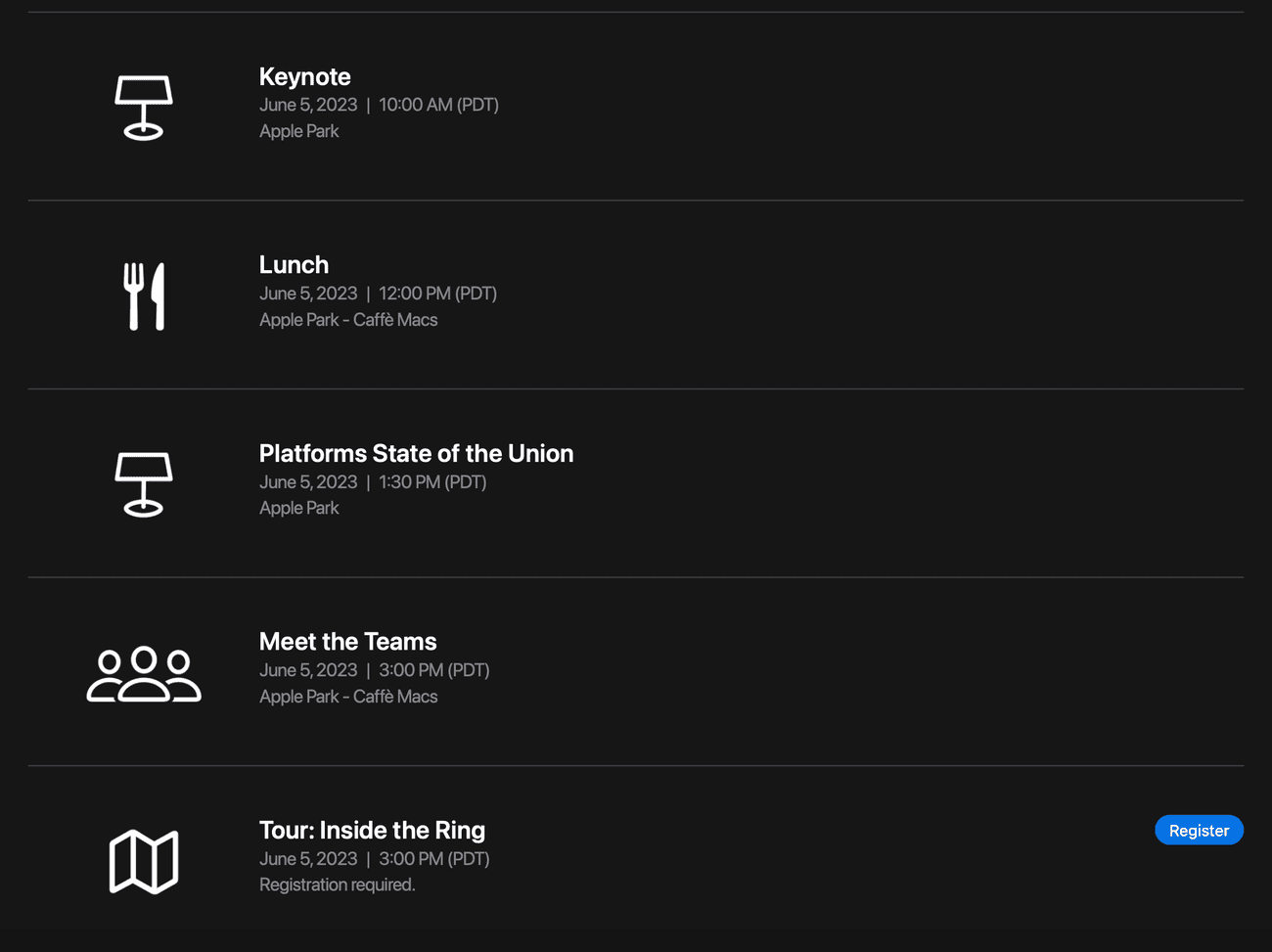 Η εναρκτήρια ομιλία θα πραγματοποιηθεί τη Δευτέρα 5 Ιουνίου, αλλά οι προγραμματιστές μπορούν να κάνουν check in στην εκδήλωση την Κυριακή. Πριν από την κεντρική ομιλία, οι προγραμματιστές μπορούν να συμμετάσχουν σε ένα πρωινό στο Apple Park. Η κεντρική ομιλία ξεκινά στις 10 π.μ., αλλά αυτό δεν θα είναι το μόνο γεγονός της ημέρας. Οι προγραμματιστές θα μπορούν να συμμετάσχουν στο Platforms State of the Union, μια άλλη κεντρική ομιλία στην οποία η Apple θα μοιραστεί περισσότερες λεπτομέρειες σχετικά με τις ανακοινώσεις της ημέρας.