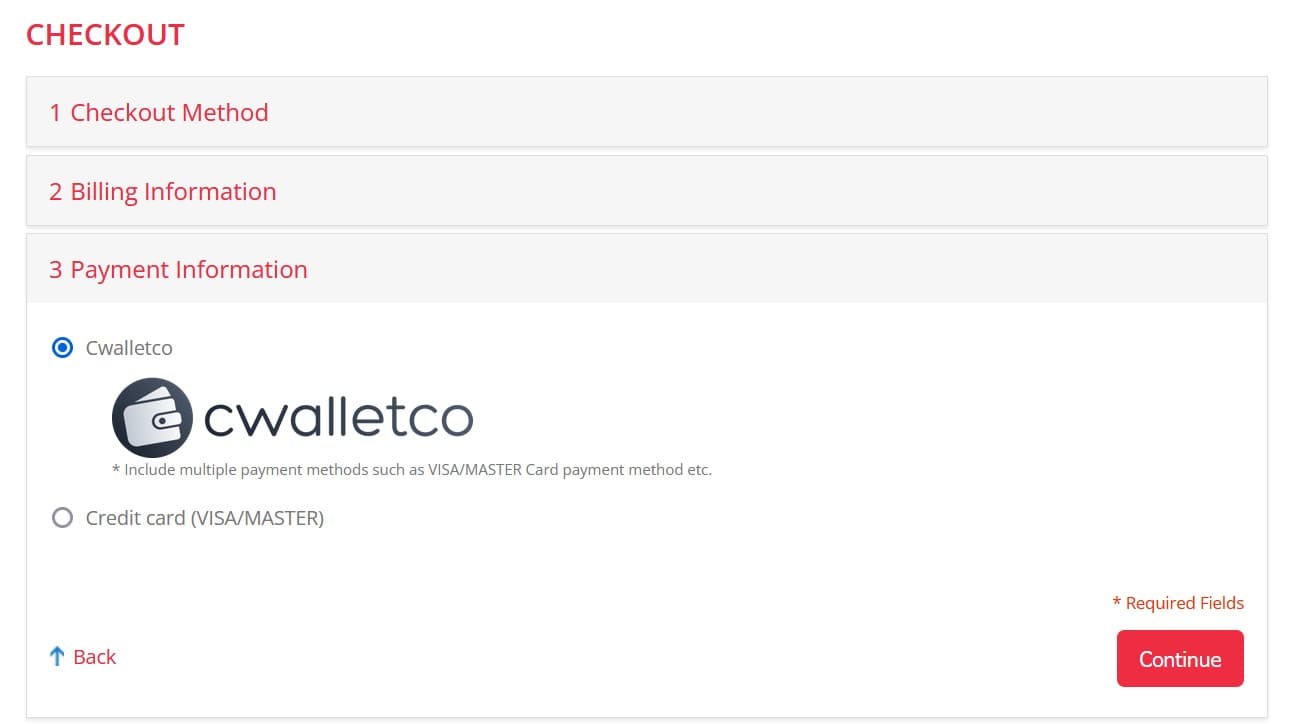 - Θα δείτε την επιλογή Cwalletco αυτόματα επιλεγμένη εδώ. Μην ανησυχείτε, θα μπορείτε να χρησιμοποιήσετε το PayPal για να πληρώσετε με ασφάλεια χρησιμοποιώντας το CC σας αργότερα. Προς το παρόν, κάντε κλικ στο κουμπί συνέχεια και “Υποβολή παραγγελίας”