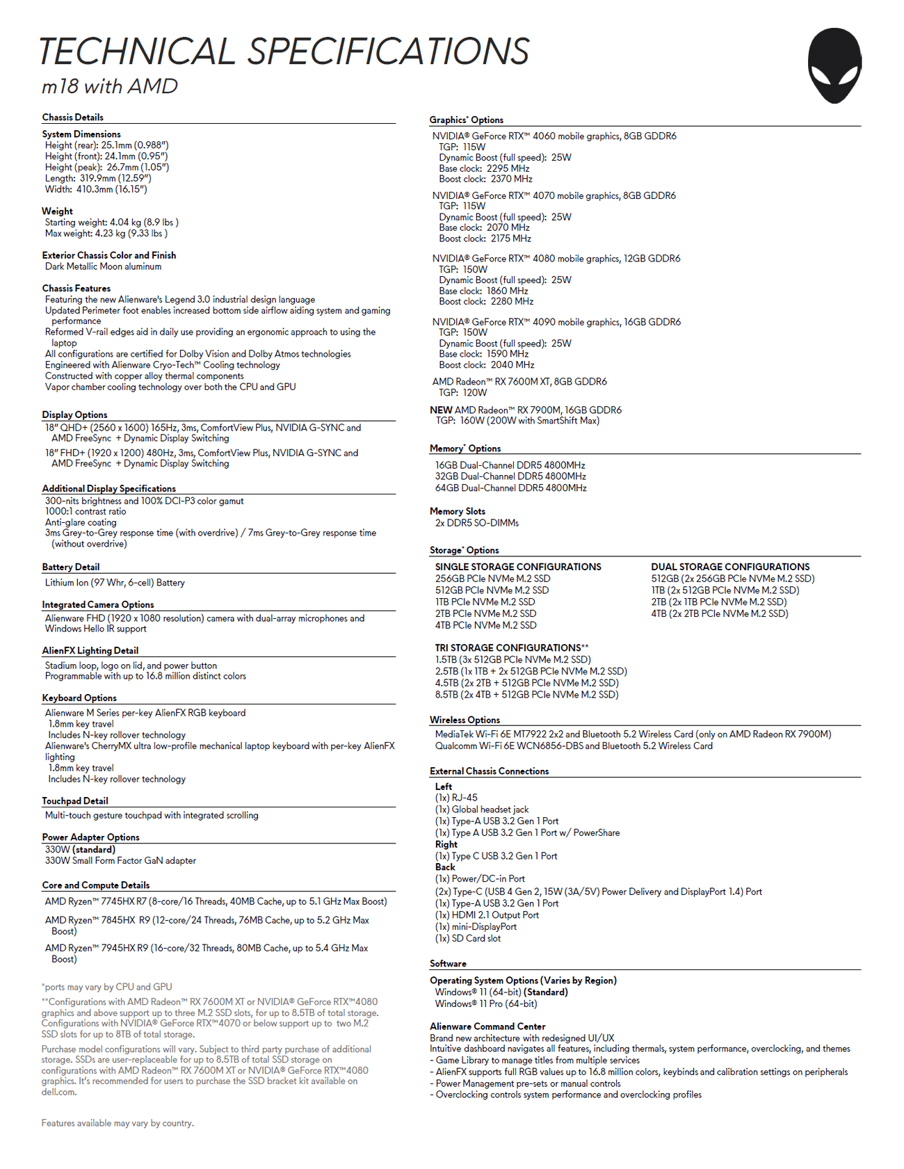 Άλλες προδιαγραφές του φορητού υπολογιστή Alienware m18 “AMD Advantage” περιλαμβάνουν υποστήριξη μνήμης DDR5-4800 έως και 64 GB (Dual-Channel), SSDs NVMe M.2 έως και 8,5 TB σε επιλογές τριπλής αποθήκευσης, έναν προσαρμογέα τροφοδοσίας 330 W GaN που τροφοδοτεί την μπαταρία 6 κυψελών 97 Whr και επιλογές οθόνης που περιλαμβάνουν μια επιλογή QHD+ (165Hz) και FHD+ (480Hz) 18″. Για την ψύξη όλου αυτού του υλικού, το Alienware m18 διαθέτει τον βιομηχανικό σχεδιασμό Legend 3.0 με ψύξη Cryo-Tech και θερμικά εξαρτήματα από κράμα χαλκού, τα οποία ενσωματώνουν ψύξη με θάλαμο ατμών τόσο για τη CPU όσο και για τη GPU.