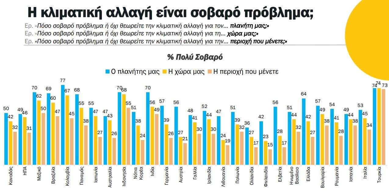 Η μεγάλη πλειονότητα των πολιτών όλων των χωρών δηλώνει ανησυχία για την κλιματική αλλαγή, με την αναλογία στην Ελλάδα να φτάνει τους οκτώ στους δέκα. Όμως, σχεδόν σε κάθε χώρα, η κλιματική αλλαγή θεωρείται πιο σοβαρό πρόβλημα για τον πλανήτη, παρά για τη χώρα, και λιγότερο για την περιοχή που ζουν οι πολίτες.