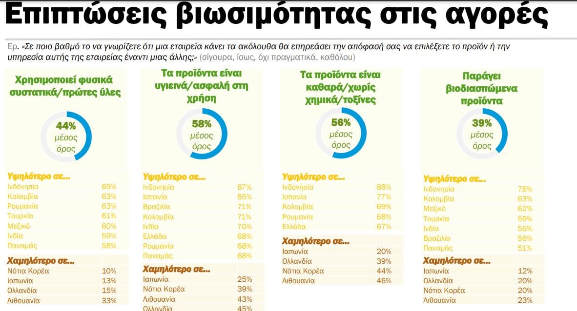 Στο ερώτημα του κατά πόσον αν μια εταιρεία χρησιμοποιεί μια σειρά παραγόντων βιωσιμότητας επηρεάζει την απόφαση των αγορών τους, κατά μέσο όρο περίπου τέσσερις στους δέκα καταναλωτές δηλώνουν ότι μια εταιρεία που μειώνει τις συσκευασίες, περιορίζει τη χρήση πλαστικών, εκμηδενίζει τις εκπομπές CO2 και μειώνει τη σπατάλη ενέργειας ή νερού, σίγουρα θα επηρεάσει την απόφασή τους. Οι αναλογίες, όμως, ποικίλουν σημαντικά μεταξύ των χωρών.