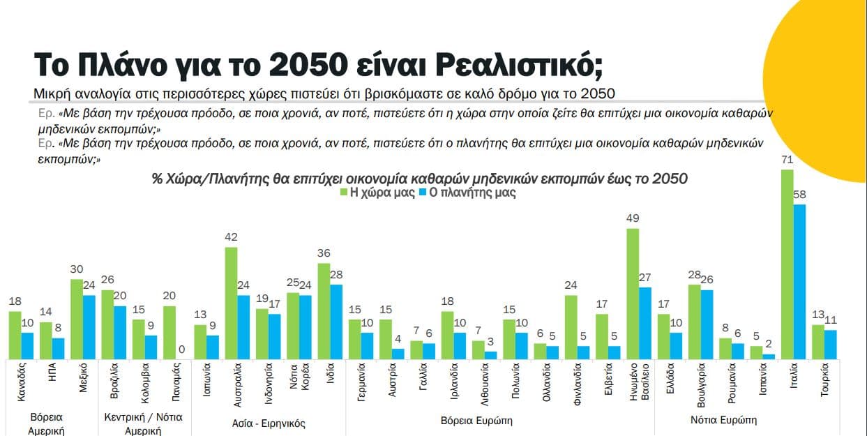 Αξιοσημείωτη είναι η δυσπιστία των πολιτών όσον αφορά τη ρεαλιστικό του πλάνου για τη μείωση των εκπομπών μέχρι το 2050. Αυτό που προέκυψε από τις απαντήσεις είναι ότι μόνο μια μικρή αναλογία στις περισσότερες χώρες πιστεύει ότι βρισκόμαστε σε καλό δρόμο για το 2050.