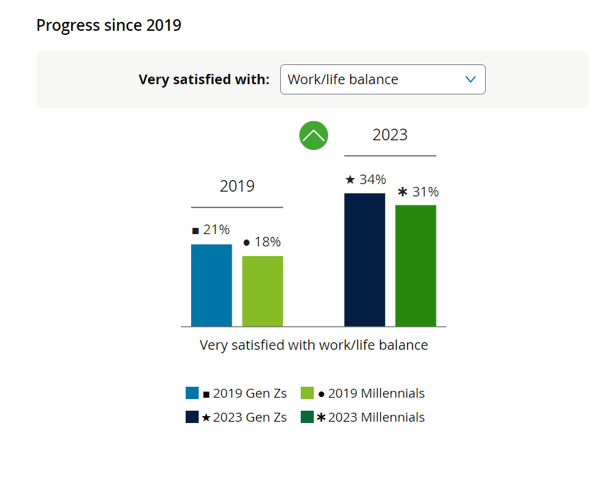 Οι ερωτηθέντες Gen Z και millennials βλέπουν τους εργοδότες να σημειώνουν πρόοδο σε ορισμένους βασικούς τομείς ακόμη και πριν από την πανδημία. Περίπου το ένα τρίτο των Gen Z και millennials εργαζομένων πλήρους ή μερικής απασχόλησης δηλώνουν πολύ ικανοποιημένοι με την ισορροπία μεταξύ της εργασίας και της ζωής τους, σε σύγκριση με μόνο έναν στους πέντε το 2019. Σημειώνεται επίσης ότι η ικανοποίηση από την ευελιξία στην εργασία, μαζί με τη διαφορετικότητα, την ισότητα και τη συμπερίληψη (DEI) έχουν επίσης αυξηθεί.