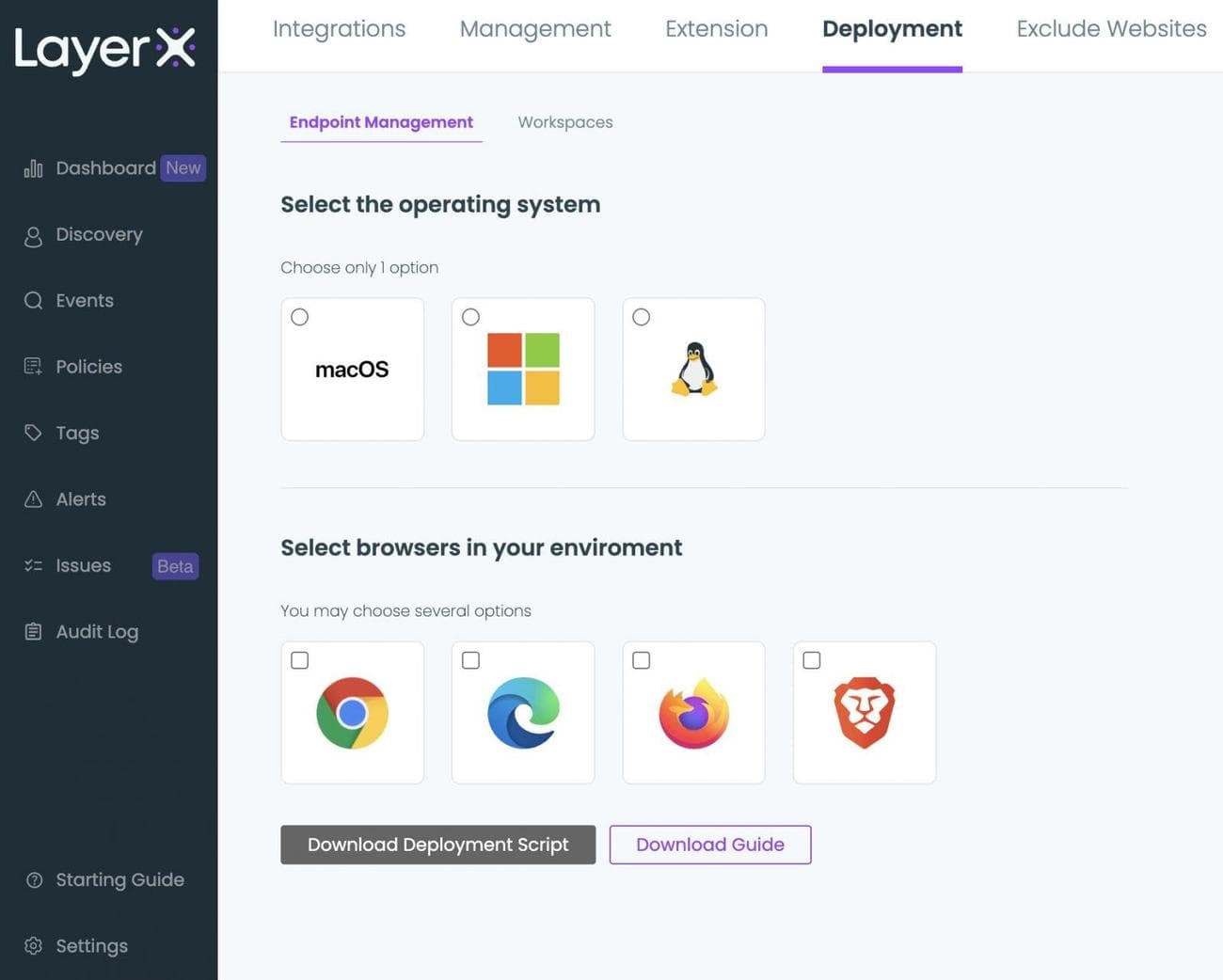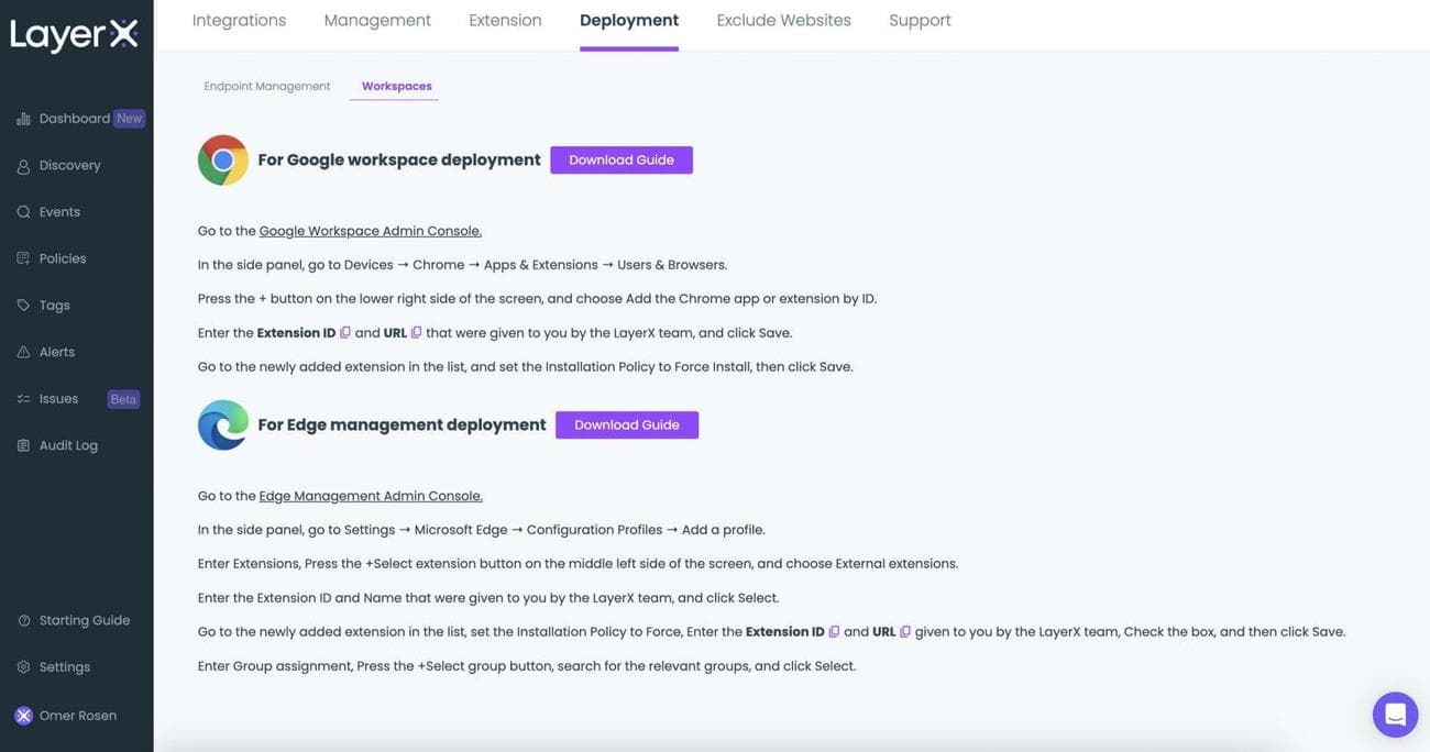 LayerX is designed for easy installation on top of the organization’s existing browser infrastructure. The user can distribute it through a group policy, any enterprise device management platform, or the browser’s management workspace.
