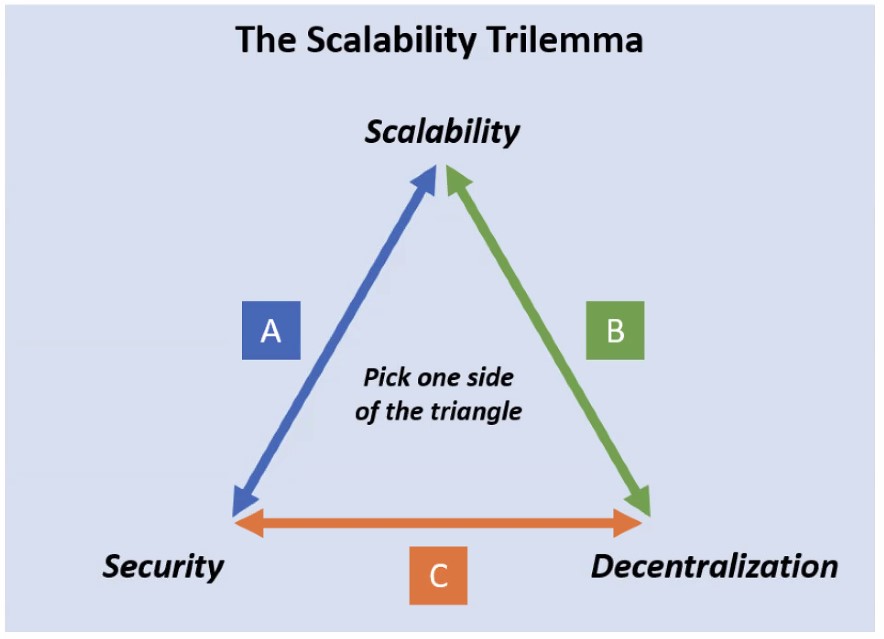 σχεδιάζοντας το Bitcoin, είχε να αντιμετωπίσει ένα αμείλικτο τρίλημμα. Να επιλέξει την ανάπτυξη σε δύο από τα εξής τρία χαρακτηριστικά: Επεκτασιμότητα (scalability), ασφάλεια (security), αποκέντρωση (decentralization).