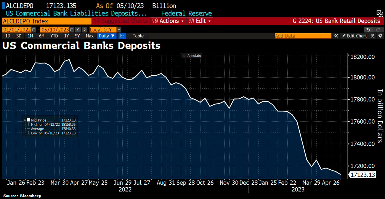 Μια που αναφερθήκαμε σε bank run, κάτι παρόμοιο εξελίσσεται σε αργή ταχύτητα στις αμερικάνικες τράπεζες. Ο ρυθμός απόσυρσης χρημάτων από τους τραπεζικούς λογαριασμούς, για τρίτη συνεχόμενη εβδομάδα είναι