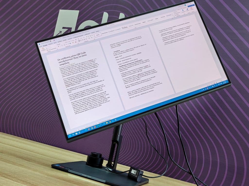 Στη συσκευασία θα βρείτε και ένα μαύρο «σκέπαστρο», που καλύπτει την περιφέρεια της οθόνης, έτσι ώστε να μην επηρεάζεται από τον φωτισμό του χώρου, είτε φυσικό είτε τεχνητό. Η οθόνη ενσωματώνει ακόμα και δύο ηχεία, των 3 watts το καθένα, διευκολύνοντας την οργάνωση του γραφείου σας, ώστε να μη χρειάζεστε πρόσθετα speakers. Όσον αφορά τις θύρες, περιλαμβάνει δύο HDMI, μία DisplayPort, τέσσερεις USB-A, μία USB-B και μία USB-C. Διαθέτει επίσης μία στερεοφωνική έξοδο για ακουστικά, ώστε να μην ενοχλείτε τους γύρω σας, όπως και μία θύρα microUSB, η οποία εξυπηρετεί έναν συγκεκριμένο σκοπό. Όπως είπαμε, πρόκειται για επαγγελματική οθόνη, οπότε είναι εξ αρχής ρυθμισμένη στο χρωματικό προφίλ Adobe RGB, που θεωρείται ως το πιο σύνηθες standard για τις περισσότερες γραφιστικές εφαρμογές.