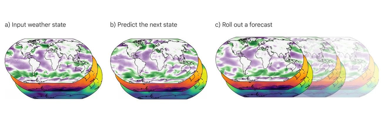 Αυτή είναι μια σημαντική πτυχή: αποτελεσματικότητα. Η «αριθμητική πρόβλεψη καιρού», τα παραδοσιακά μοντέλα που βασίζονται στη φυσική, είναι υπολογιστικά ακριβά. Φυσικά μπορούν να προβλέψουν γρηγορότερα από ό, τι συμβαίνει ο καιρός, διαφορετικά θα ήταν άχρηστα — αλλά πρέπει να βάλεις έναν υπερυπολογιστή στη δουλειά και ακόμη και τότε μπορεί να χρειαστεί λίγος χρόνος για να κάνεις προβλέψεις με μικρές παραλλαγές.