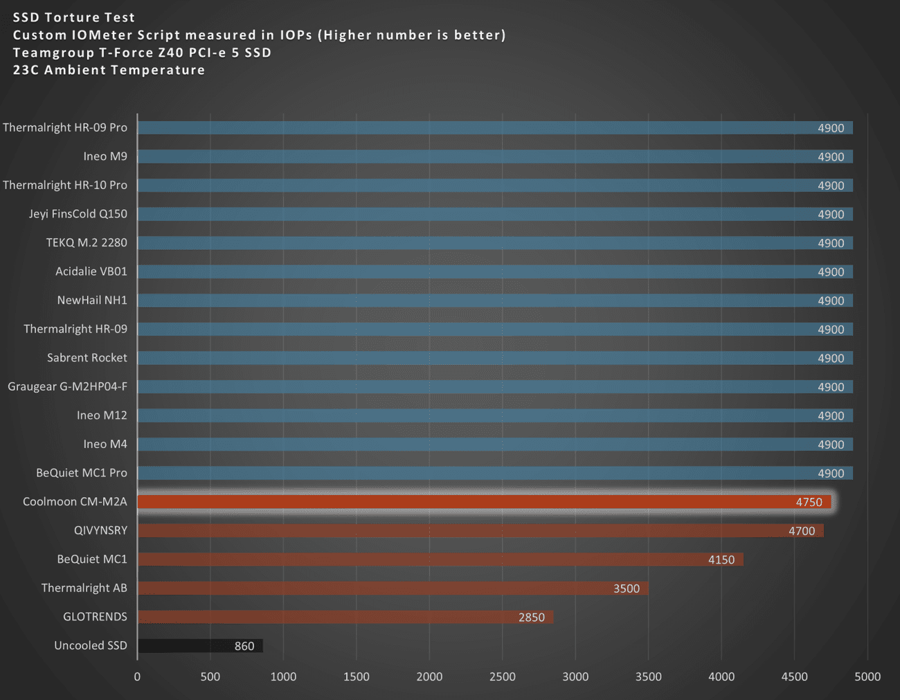 είναι στην πραγματικότητα η μονάδα με τις καλύτερες επιδόσεις των ψυκτών που δεν περνούν αρκετά τη θερμική μου δοκιμή. Διατηρώντας κατά μέσο όρο 4750 IOPs κατά τη διάρκεια των 30 λεπτών stress tests, αυτό εξακολουθεί να είναι το 96,9% της μέγιστης απόδοσης του συγκεκριμένου SSD.