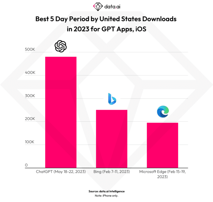 Αν και το Bing και ο Microsoft Edge σίγουρα επωφελήθηκαν από το ενδιαφέρον για το ChatGPT στο ντεμπούτο τους, βλέποντας αντίστοιχες 340.000 και 335.000 λήψεις σε iOS και Android στις καλύτερες πενθήμερές τους περιόδους τον Φεβρουάριο, η εφαρμογή ChatGPT του OpenAI ξεπέρασε εύκολα, δημιουργώντας 480.000 εγκαταστάσεις στην πρώτη πέντε ημέρες από την κυκλοφορία της στις ΗΠΑ, όταν η εφαρμογή ήταν μόνο για iOS.