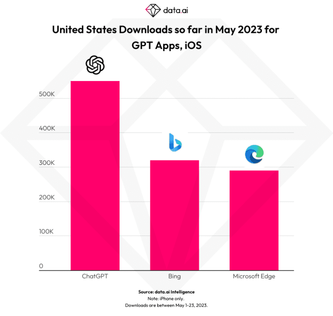 Ωστόσο, οι Bing και Edge εξακολουθούσαν να προηγούνται του ChatGPT όταν εξέτασαν όλες τις λήψεις στις ΗΠΑ τον Μάιο και στα δύο καταστήματα εφαρμογών — αλλά όχι όταν συγκρίνουν μόνο τις εγκαταστάσεις iOS για τον μήνα. Αυτό υποδηλώνει ότι το ChatGPT μπορεί σύντομα να προχωρήσει σε αυτές τις εναλλακτικές λύσεις που εστιάζονται στην αναζήτηση.