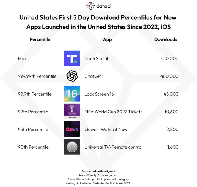 Αν και είναι διαθέσιμο μόνο για μια εβδομάδα, το ChatGPT κατατάσσεται ήδη στην πρώτη πεντάδα μεταξύ των εφαρμογών chatbot τεχνητής νοημοσύνης με βάση τις λήψεις στις ΗΠΑ τον Μάιο του 2023. Τη στιγμή που ο αριθμός του data.ai μειώθηκε, συνέκρινε το ChatGPT και άλλες κορυφαίες εφαρμογές chatbot για από τον Μάιο έως τις 23 — επομένως, τεχνικά, λιγότερο από μία εβδομάδα από την κυκλοφορία του ChatGPT.
