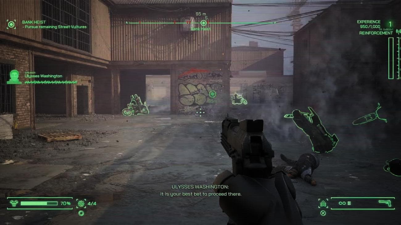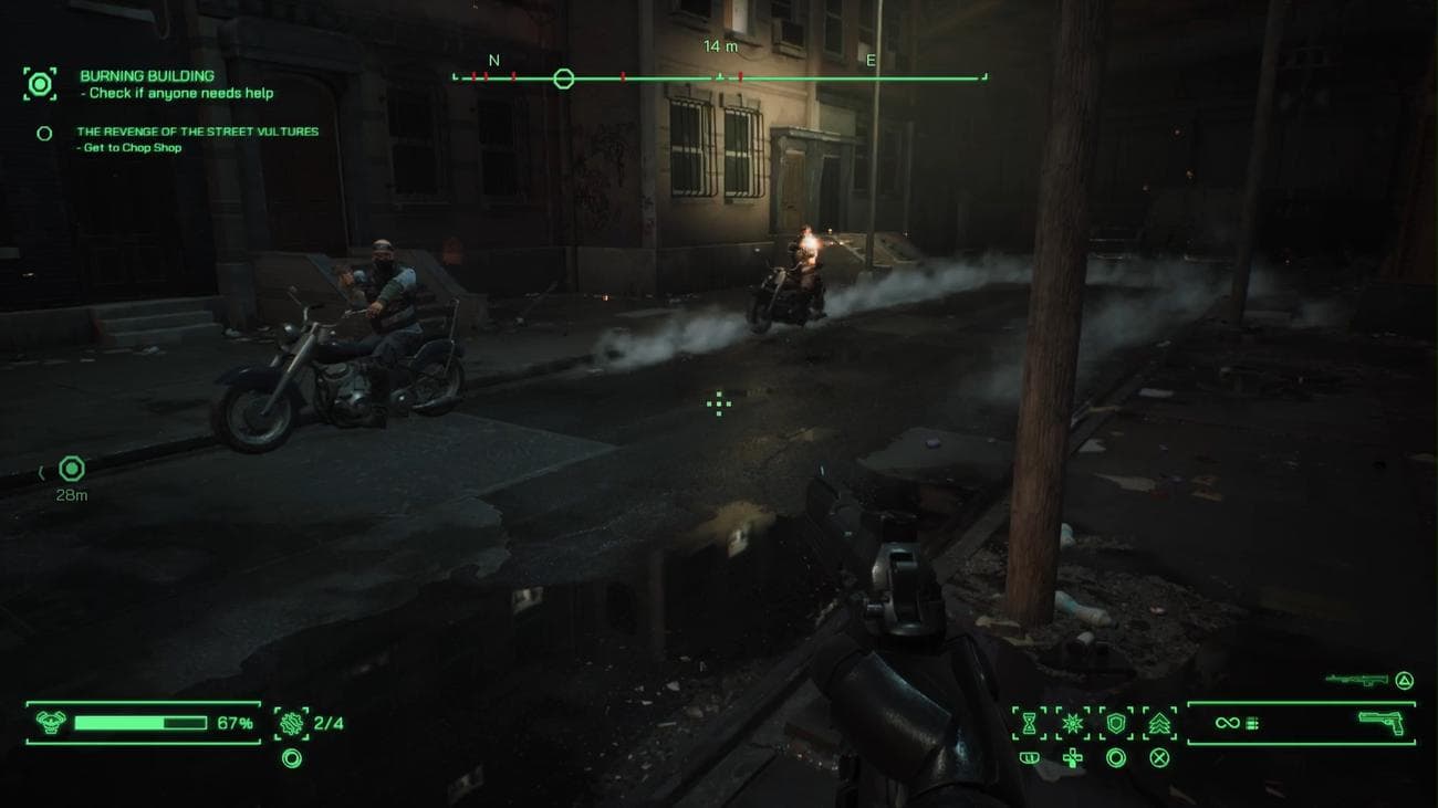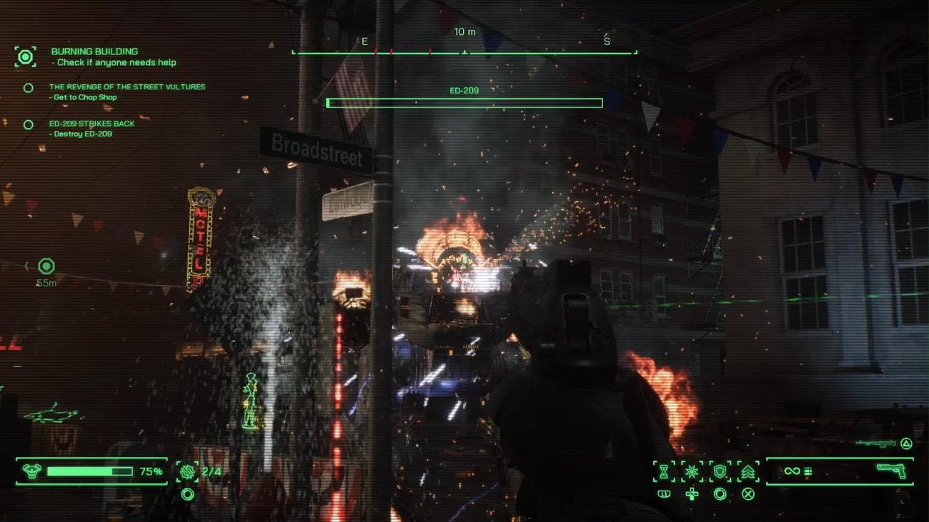 Σε ότι αφορά το shooting, το RoboCop: Rogue City είναι σίγουρα διασκεδαστικό, καθώς καταφέρνει να αποδώσει τα υψηλά επίπεδα βίας και gore των κινηματογραφικών ταινιών, αλλά όπως σημειώσαμε και νωρίτερα είναι κάπως μονότονο. Ο εξοπλισμός σας περιλαμβάνει το κλασικό Auto-9, καθώς και κάποια όπλα που μπορείτε να σηκώσετε από τα κουφάρια των νεκρών αντιπάλων σας, αλλά το gunplay δεν είναι τόσο απολαυστικό όσο αυτό που προσφέρει το Auto-9, η motherboard του οποίου μπορεί να αναβαθμιστεί με διάφορα chips. Κακά τα ψέμματα, μόλις βρείτε την πλακέτα με το αυτόματο reload δεν θα χρειαστεί να ψάξετε για κάποια άλλη, όμως υπάρχουν και περισσότερες επιλογές για όσους θέλουν να πειραματιστούν. Αξίζει επίσης να σημειωθεί ότι μπορείτε να συνδυάσετε τα chips για να παράγετε νέα και ισχυρότερα, που αυξάνουν ακόμη περισσότερο τα traits του όπλου σας, όπως το armor penetration.