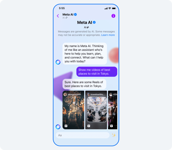 α πραγμάτων που ταιριάζουν με το ερώτημά σας. Για παράδειγμα, εάν σχεδιάζατε ένα ταξίδι με φίλους σε μια ομαδική συνομιλία, θα μπορούσατε να ζητήσετε από τη Meta AI να σας προτείνει τα καλύτερα μέρη για επίσκεψη και να μοιραστείτε τους κυλίνδρους αυτών των κορυφαίων τοποθεσιών και αξιοθέατων, εξηγεί η εταιρεία.