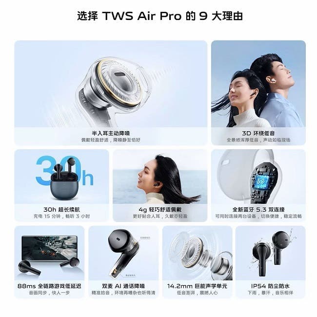παρουσίασης προϊόντων της σειράς vivo S17, η εταιρεία αποκάλυψε την τελευταία της προσθήκη – το vivo TWS Air Pro, το οποίο σηματοδοτεί την είσοδό της στον κόσμο των semi in-ear ακουστικών TWS με ενεργή ακύρωση θορύβου. Το μονό ακουστικό vivo TWS Air Pro είναι απίστευτα ελαφρύ, με βάρος μόνο 4 γραμμάρια. Ενσωματώνει ένα διάφραγμα δακτυλίου ακουστικής μονάδας 14,2 mm, με αποτέλεσμα βελτιωμένη ποιότητα ήχου. Το πάχος της συσκευής έχει αυξηθεί κατά 50% και η διαπερατότητα του αέρα της κοιλότητας έχει βελτιωθεί επτά φορές.