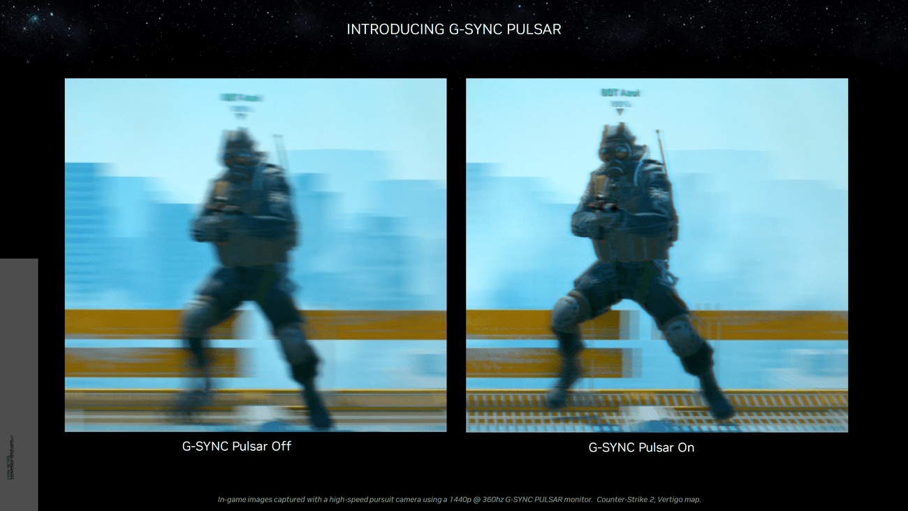 Το G-SYNC Pulsar αξιοποιεί τη δυνατότητα strobing μεταβλητής συχνότητας που περιλαμβάνεται στις οθόνες τρέχουσας γενιάς, η οποία όχι μόνο εξασφαλίζει μια ομαλή εμπειρία εμφάνισης, αλλά έχει ως αποτέλεσμα την κατάλληλη οπτική