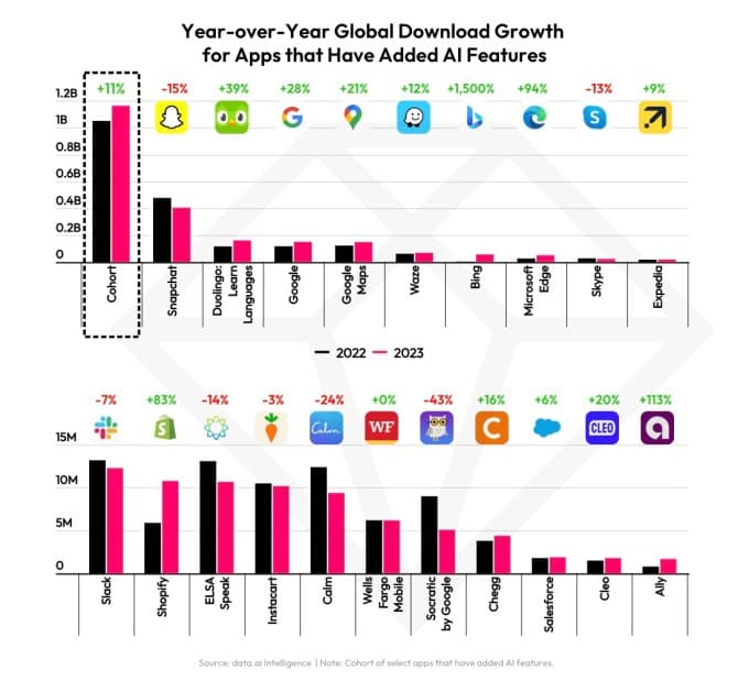 Η εταιρεία ανέφερε επίσης ότι οι παραγωγικές προόδους της τεχνητής νοημοσύνης βοήθησαν να τροφοδοτήσουν τις καταναλωτικές δαπάνες πέρυσι. Η αγορά εφαρμογών genAI επεκτάθηκε κατά 7 φορές, οδηγώντας σε νέες εμπειρίες καταναλωτών, όπως chatbots AI και γεννήτριες τέχνης AI. Οι κορυφαίες εφαρμογές περιλαμβάνουν ChatGPT, Ask AI και Open Chat, όσον αφορά τις καταναλωτικές δαπάνες. Το Data.ai σημείωσε ότι η δημοτικότητα των εφαρμογών τεχνητής νοημοσύνης ήταν «αρκετά παγκόσμια», αλλά το είδος δεν κατατάχθηκε μεταξύ των ειδών που ξεχώρισαν στην Κίνα, την
