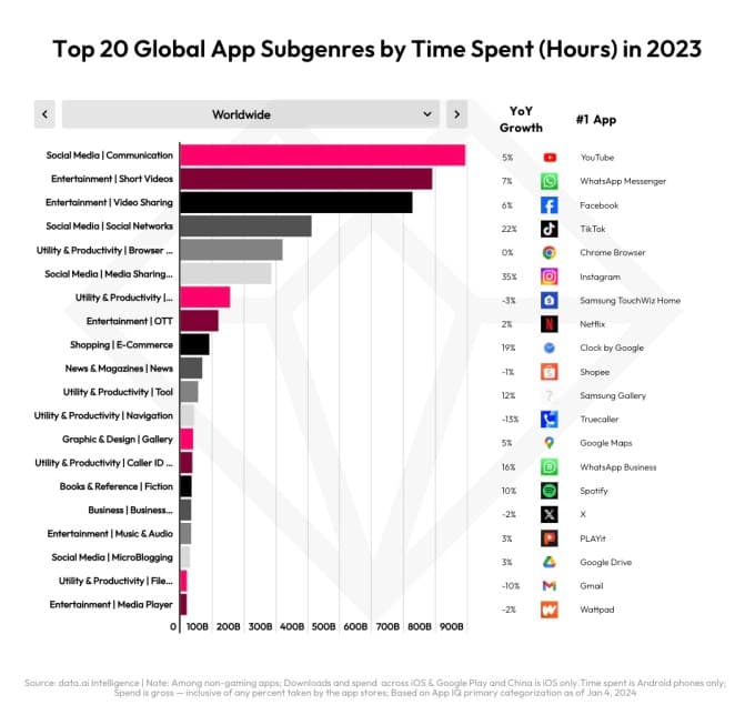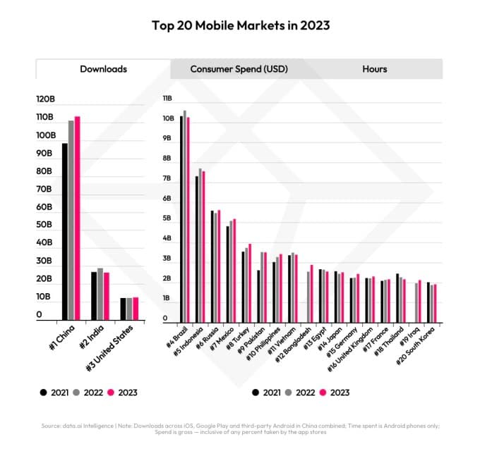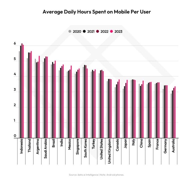 Εν τω μεταξύ, σε 10 κορυφαίες αγορές, ο μέσος όρος ημερήσιων ωρών που δαπανώνται σε κινητά ανά χρήστη αυξήθηκε κατά 6% από το 2022 και έφτασε τις περισσότερες από 5 ώρες. Εδώ, εφαρμογές όπως το YouTube, το WhatsApp, το Facebook, το TikTok, το Chrome, το Instagram, το Netflix και άλλες βοήθησαν στην αύξηση του χρόνου που δαπανάται.