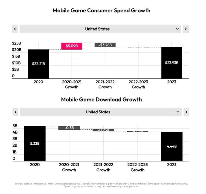 Τα παιχνίδια για κινητά, ωστόσο, δεν πήγαν τόσο καλά το 2023, με τις δαπάνες να μειώνονται κατά 2% σε ετήσια βάση στα 107 δισεκατομμύρια δολάρια. Οι λήψεις παιχνιδιών ήταν περίπου σύμφωνες με τα προηγούμενα χρόνια, αντιπροσωπεύοντας τα 88 δισεκατομμύρια από τα 257 δισεκατομμύρια συνολικές λήψεις. Τα κορυφαία είδη περιλάμβαναν το Hypercasual, το Simulation και το Action. Μεταξύ των παιχνιδιών που ξεχώρισαν τη χρονιά ήταν το Monopoly GO και το EA Sports FC Mobile Soccer. Σε ένα άλλο ορόσημο, το Genshin Impact ξεπέρασε τα 4 δισεκατομμύρια δολάρια σε δαπάνες ζωής. Παιχνίδια όπως το Block Blast Adventure Master και το Attack Hole αύξησαν τις λήψεις, εν μέσω έκπληξης όπως το Avatar Life. Το Gacha Life 2 και το Eggy Party σημείωσαν επίσης μεγάλα κέρδη σε λήψεις και χρήση.