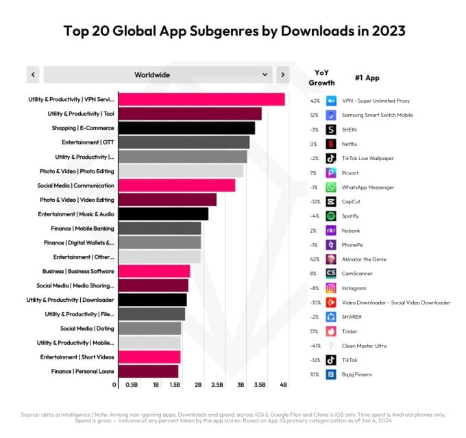 Οι καταναλωτικές δαπάνες για εφαρμογές που δεν αφορούν παιχνίδια αυξήθηκαν κατά 11% από έτος σε έτος το 2023 φτάνοντας τα 64 δισεκατομμύρια δολάρια. Οι εφαρμογές κοινωνικής δικτύωσης και η οικονομία των δημιουργών οδήγησαν αυτήν την ανάπτυξη με το TikTok να συμβάλλει στην πρωτοπορία. Πέρυσι, η εφαρμογή βίντεο σύντομης μορφής σημείωσε ένα νέο ορόσημο άνω των 10 δισεκατομμυρίων δολαρίων σε όλη τη διάρκεια