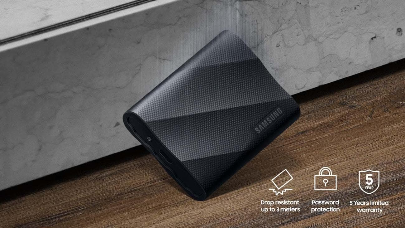 Samsung T9 έχει στιβαρό εξωτερικό και μπορεί να επιβιώσει σε πτώσεις από ύψος 3 μέτρων. Έρχεται επίσης με ένα μοναδικό