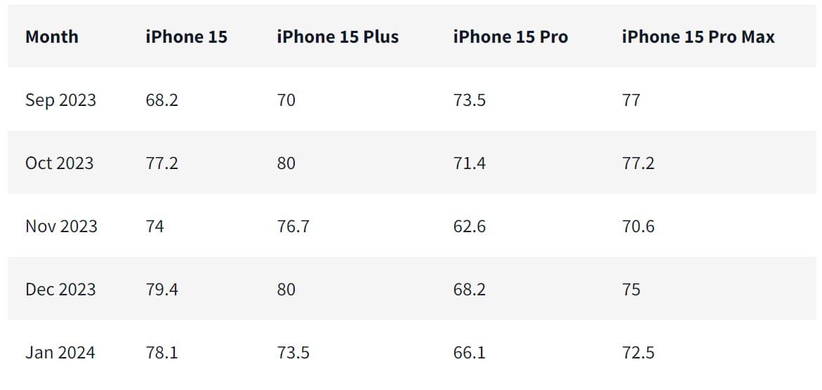 Καθώς οι βαθμολογίες ικανοποίησης πελατών μειώνονται, οι χρήστες iPhone 15 και iPhone 15 Plus προτιμούν κατά κάποιο τρόπο τις αγορές τους σε σχέση με εκείνους που αναβάθμισαν σε πιο premium συσκευές. Οι κριτικές 5 αστέρων του iPhone 15 για τον Ιανουάριο του 2024 ανέρχονται στο 78 τοις εκατό, ενώ το iPhone 15 Plus στο 73,5 τοις εκατό, καθιστώντας τις υψηλότερες από τις τιμές για το iPhone 15 Pro και το iPhone 15 Pro Max.