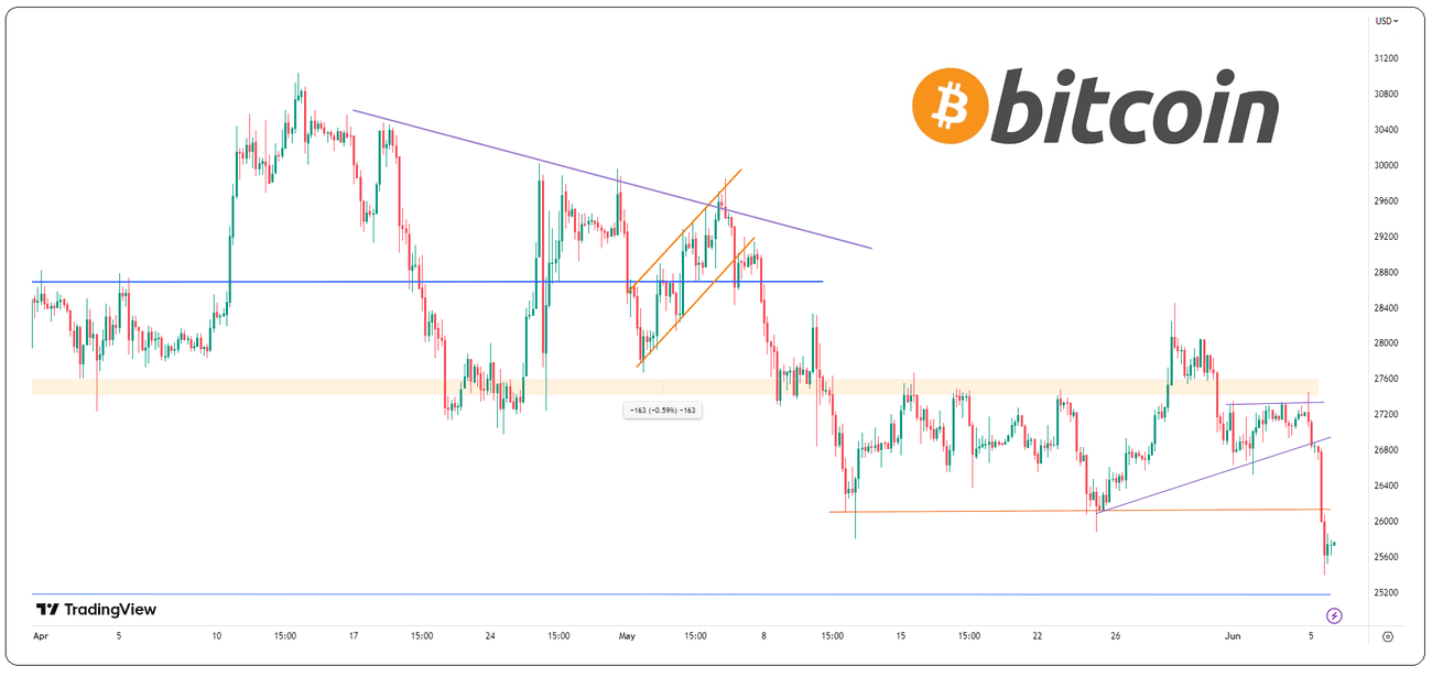 . Πτώση της τάξης του 5% στο Bitcoin σε καμία περίπτωση δεν μπορεί να ερμηνευτεί ως πανικός. Η τιμή του Bitcoin για να σταματήσει την πτώση δεν χρειάστηκε ούτε την στήριξη των 25.150 δολαρίων (μπλε οριζόντια γραμμή). Φρέναρε πριν ακόμα φτάσει εκεί που υπήρχαν «ενισχύσεις» από τους αγοραστές.