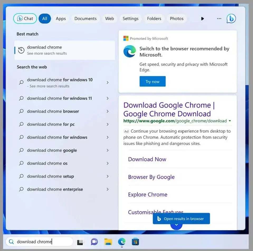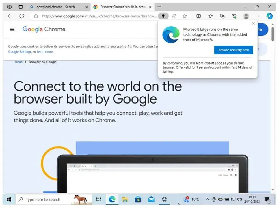 «ακόμα πιο επιθετική προσέγγιση” όταν ο χρήστης επιχειρεί να κατεβάσει το Chrome. Συγκεκριμένα, αναφέρει ότι «η Microsoft παρεμβαίνει δύο επιπλέον φορές στη διαδικασία εγκατάστασης του Chrome».