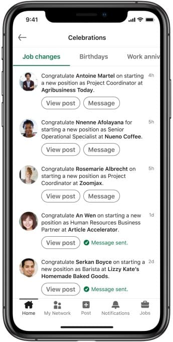 Πέρυσι, το LinkedIn άρχισε να δοκιμάζει μια σελίδα προορισμού «Εορτασμοί» στην ενότητα Τα δίκτυά μου. Η σελίδα απαριθμούσε ορόσημα όπως αλλαγές εργασίας, γενέθλια και επετείους εργασίας. Ωστόσο, απλώς παρέμεινε σε beta.
