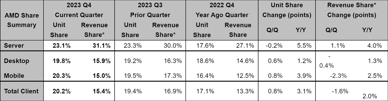 , πρέπει πρώτα να μιλήσουμε για την πλευρά του πελάτη όπου η AMD σημείωσε αυξημένο μερίδιο αγοράς χάρη στην πρόσθετη προσφορά των επεξεργαστών επιτραπέζιων και φορητών υπολογιστών Ryzen 7000. Το τμήμα επιτραπέζιων υπολογιστών αυξήθηκε από 19,2% το τρίτο τρίμηνο του 2023 σε 19,8% το τέταρτο τρίμηνο του 2023, ενώ το τμήμα κινητής τηλεφωνίας αυξήθηκε από 19,5% το τρίτο τρίμηνο του 2023 σε 20,3% το τέταρτο τρίμηνο του 2023. Αυτό είναι κέρδος 1,2 μονάδων για επιτραπέζιους υπολογιστές και 3,9 μονάδες για τα κινητά τμήμα.