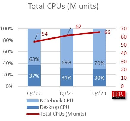 μοιράστηκε επίσης τα στατιστικά της για τις αποστολές CPU που δείχνουν ότι το τμήμα αυξήθηκε κατά 7% σε σύγκριση με το τελευταίο τρίμηνο και 22% σε σύγκριση με το προηγούμενο έτος. Ο συνολικός αριθμός αποστολών CPU έφτασε τα 66 εκατομμύρια μονάδες το 4ο τρίμηνο του 2024. Οι φορητοί επεξεργαστές αντιστοιχούν στις περισσότερες αποστολές με μερίδιο 70% έναντι 30% για επιτραπέζιους υπολογιστές. Από την πλευρά των διακομιστών, οι αποστολές αυξήθηκαν κατά 2,8% σε σύγκριση με το τελευταίο τρίμηνο, αλλά μειώθηκαν κατά 26% σε σύγκριση με το προηγούμενο έτος.