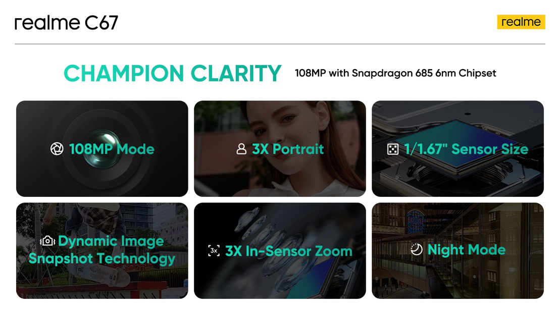 Ταυτόχρονα, η τεχνολογία 3X In-sensor Zoom στο realme C67 χρησιμοποιεί 12 εκατομμύρια pixel στο κέντρο του αισθητήρα 108MP για να μπορεί ο χρήστης να έχει τις καλύτερες δυνατές λήψεις χωρίς απώλειες. Μαζί με το 3X In-sensor Zoom, το realme C67 έχει την λειτουργία του 3X Portrait, το οποίο δίνει την δυνατότητα στις φωτογραφίες πορτραίτων ανθρώπων να έχουν περισσότερο βάθος .