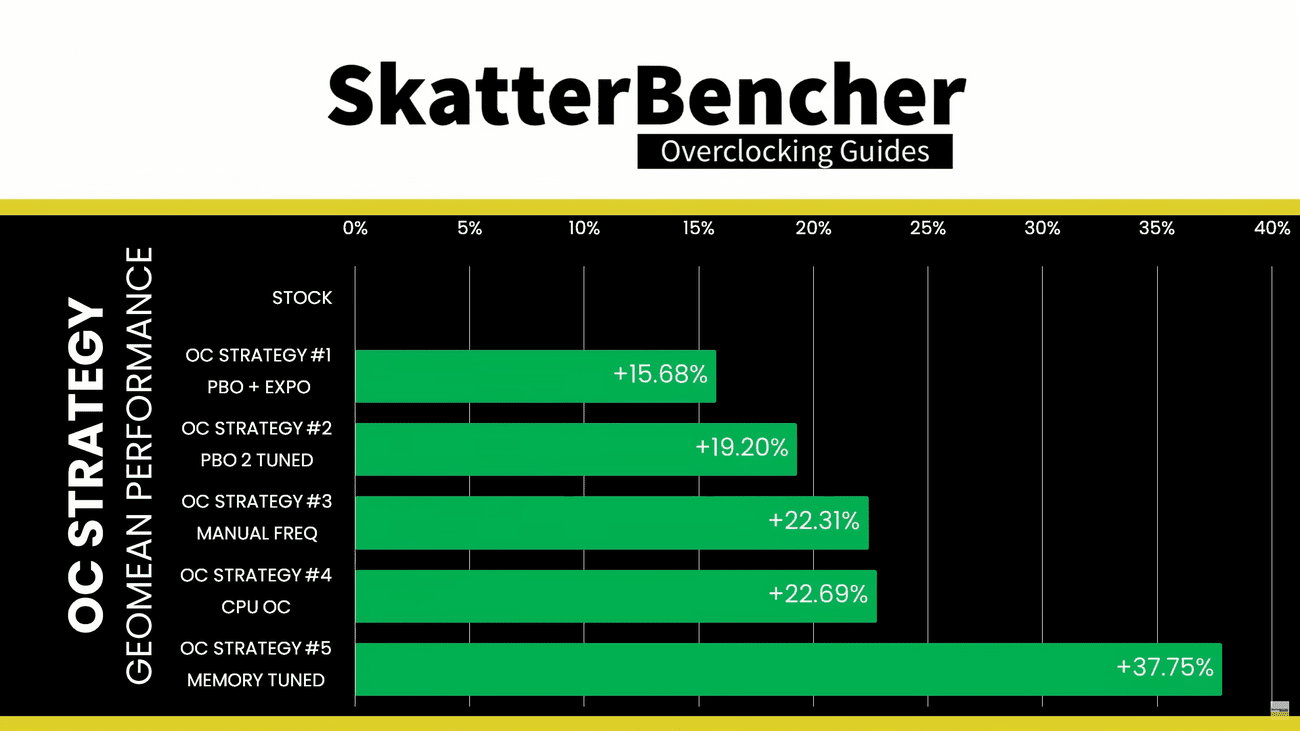 Το επόμενο βήμα ήταν να υπερχρονιστεί η ίδια η CPU με το ρολόι GFX ρυθμισμένο στα 3150 MHz. Αυτό είχε παρόμοια αποτελέσματα με την προηγούμενη στρατηγική overclocking με πολύ μικρή αύξηση της απόδοσης κατά 0,5%. Για την τελευταία τεχνική overclocking, δοκιμάστηκε ένας απλός συντονισμός μνήμης με τις μονάδες DDR5 ρυθμισμένες στα 7800 MT/s και πιο αυστηρούς χρονισμούς. Αυτό οδήγησε στο μοναδικό μεγαλύτερο κέρδος στην απόδοση με μέση άνοδο +37,75% σε σχέση με το απόθεμα και αύξηση +61,14% σε δοκιμές όπως το Furmark στα 1080p. Σύμφωνα με το overclocker, δεν είναι η ταχύτερη μνήμη που βελτιώνει την απόδοση, αλλά οι πιο αυστηροί χρονισμοί που βοηθούν το iGPU να αποκτήσει καλύτερους χρόνους πρόσβασης.