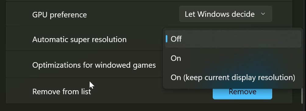 “Χρησιμοποιήστε AI για να κάνετε τα υποστηριζόμενα παιχνίδια να παίζουν πιο ομαλά με βελτιωμένες λεπτομέρειες”, αναφέρει η περιγραφή της ρύθμισης.