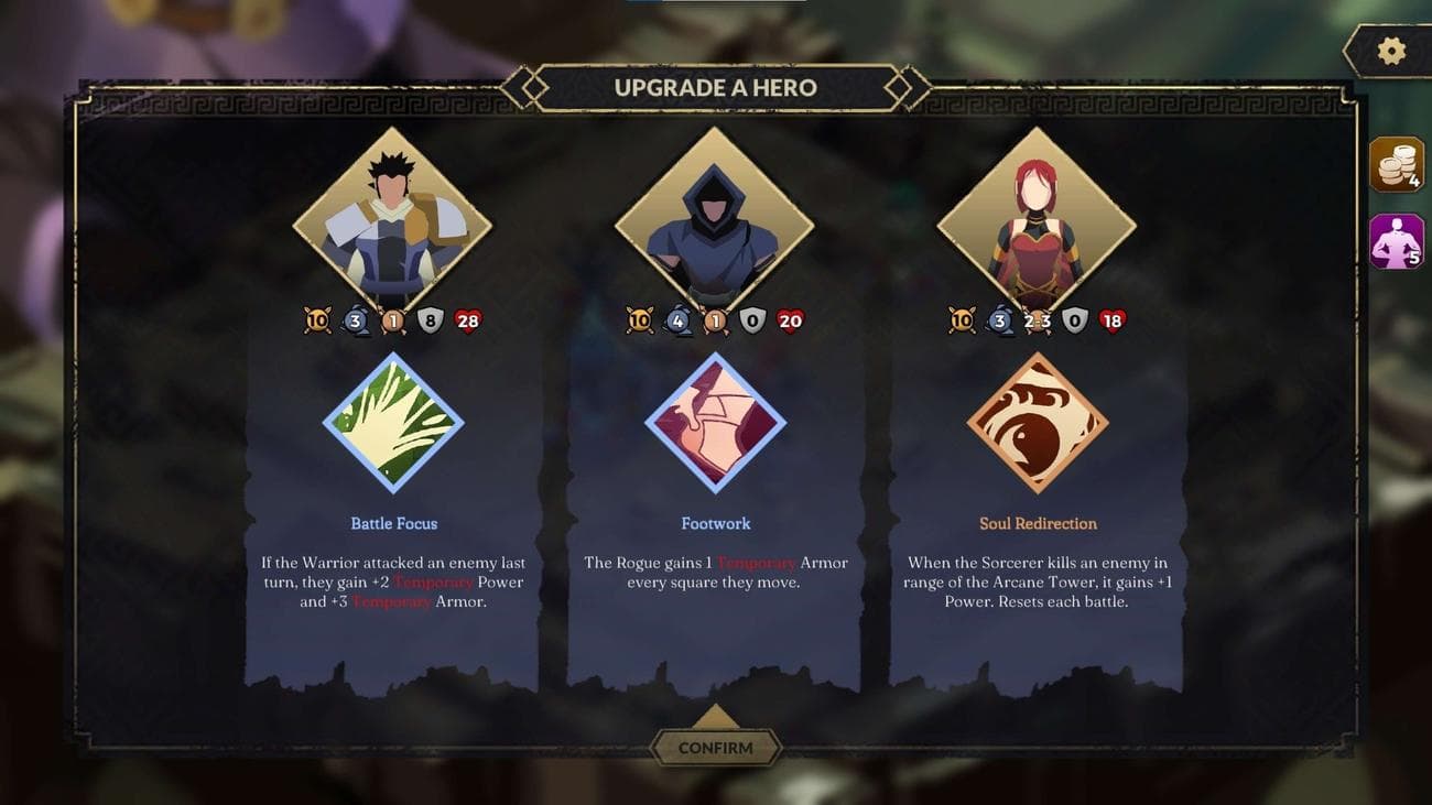 Έπειτα έχετε τους τρεις ήρωες, τον warrior ο οποίος έχει συνήθως το περισσότερο health και armor (σε εξαίρεση με τον Rook) και ένα μέτριο attack, την mage που κατέχει πολύ καλό damage και μεγάλο range, αλλά είναι ευάλωτη σε close range combat οπότε είναι καλό να κρατιούνται κάποιες αποστάσεις και τέλος ο rogue, όπου έχει έναν πολύ καλό συνδυασμό και από τους δύο με το δυνατό του σημείο να είναι κυρίως το damage. Αυτό δεν σημαίνει όμως ότι οι ήρωες μένουν έτσι διότι κάθε φορά που νικάτε ένα wave έχετε να επιλέξετε τρεις αναβαθμίσεις με διάφορα variations κάθε φορά κάτι που κάνει το κάθε run διαφορετικό από το προηγούμενο. Στην μάχη θα βοηθήσουν σίγουρα και τα utilities που παρέχει ο Magister όπως spells και towers όπου το καθένα από αυτά είναι ζωτικής σημασίας και έχουν διαφορά ως προς το combat και το
