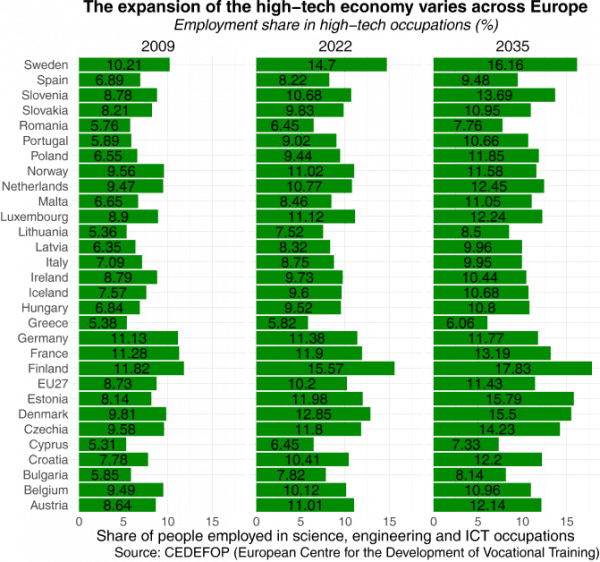 Οι σκανδιναβικές οικονομίες όπως η Σουηδία και η Φινλανδία, με έναν ήδη ισχυρό τομέα νέων επιχειρήσεων έντασης γνώσης, θα συνεχίσουν να βλέπουν τον τομέα υψηλής τεχνολογίας να αναπτύσσεται, μαζί με ορισμένες χώρες της Κεντρικής και Ανατολικής Ευρώπης όπως η Σλοβενία, η Εσθονία και η Τσεχία.