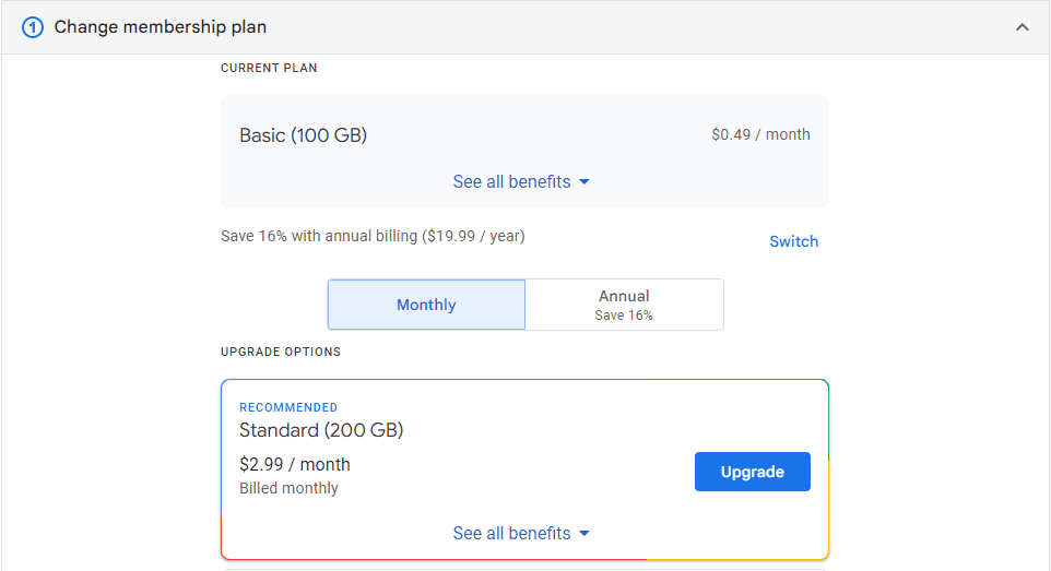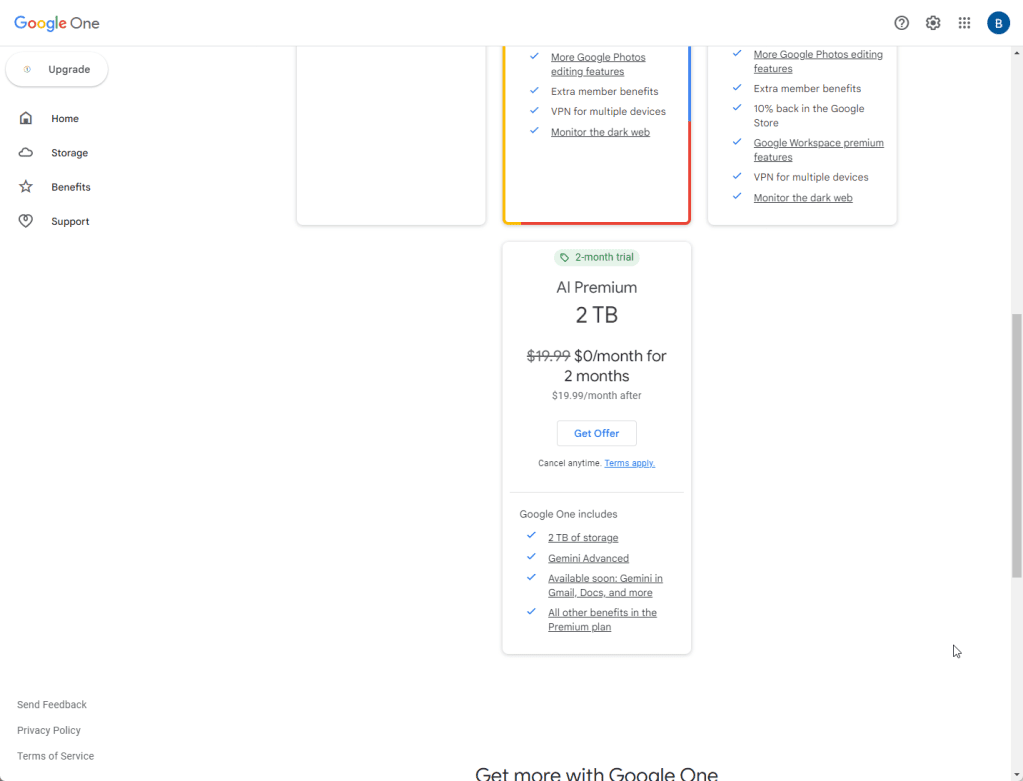 . Επιβεβαιώσαμε ότι, σε νέο λογαριασμό, αυτή η επιλογή δεν υπάρχει μέσω κανενός από τα κύρια κανάλια στα οποία μπορείτε να εγγραφείτε σε ένα νέο πρόγραμμα. Αντίθετα, στους λογαριασμούς προσφέρεται μόνο το πρόγραμμα των 100 GB και οι δύο προσφορές των 2 TB χωρίς τίποτα ενδιάμεσο, όπως απεικονίζεται παρακάτω.