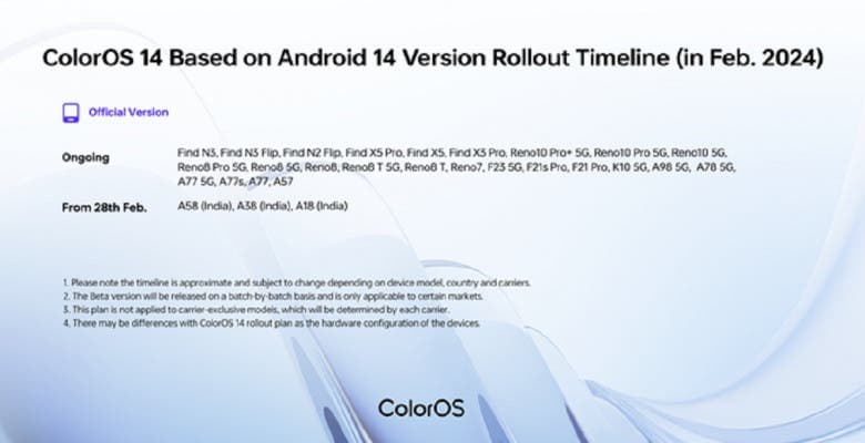 Όπως επιβεβαιώθηκε από την Oppo, η ενημέρωση ColorOS 14 για τα τρία smartphone της σειράς A που αναφέρονται παραπάνω θα ξεκινήσει να κυκλοφορεί στις 28 Φεβρουαρίου. Ως έχει, τα τρία smartphone της σειράς τρέχουν το ColorOS 13, το οποίο βασίζεται στο Android 13. Με την ενημέρωση , θα αναβαθμιστούν στο πιο πρόσφατο Android 14.