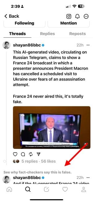 Στις δοκιμές μας, ο έλεγχος γεγονότων αρχικά απέκρυψε την ανάρτηση Threads με το βίντεο, αλλά πρόσφερε ένα κουμπί “Εμφάνιση ανάρτησης” για να κάνετε κλικ και να το δείτε. Θα μπορούσατε προαιρετικά να πατήσετε “Δείτε γιατί” εάν θέλετε να μάθετε γιατί κρύβεται για ψευδείς πληροφορίες. Ωστόσο, η λειτουργία φαίνεται λίγο υπανάπτυκτη, καθώς οι σύνδεσμοι σε ιστότοπους ελέγχου δεδομένων λειτουργούσαν μόνο σε κινητά και όχι σε επιτραπέζιους υπολογιστές και η ενημερωτική προειδοποίηση κάτω από το βίντεο, μόλις προβληθεί, ήταν σε μικρό κείμενο που θα μπορούσατε εύκολα να χάσετε.