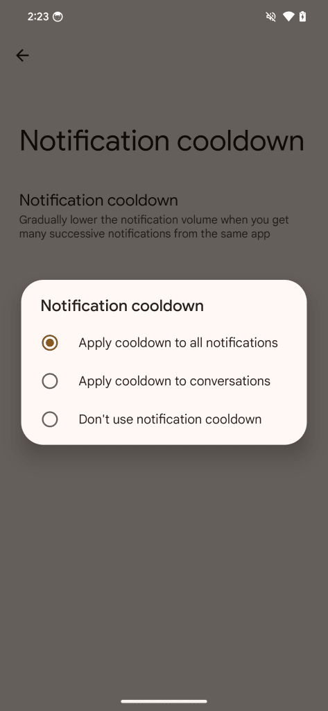 > Ψύξη ειδοποιήσεων. Εδώ, μπορείτε να αποφασίσετε εάν θέλετε όλες οι ειδοποιήσεις να έχουν cooldown ή μόνο εκείνες που το Android θεωρεί ότι είναι “συνομιλία”.