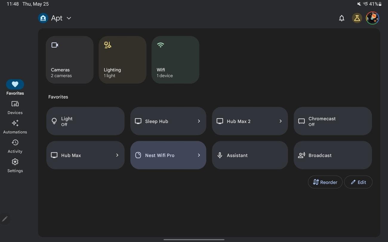 : Based on the upcoming redesign, we see a navigation rail with Favorites, Devices, Automations, Activity, and Settings. The Favorites tab clearly takes advantage of the additional space. -