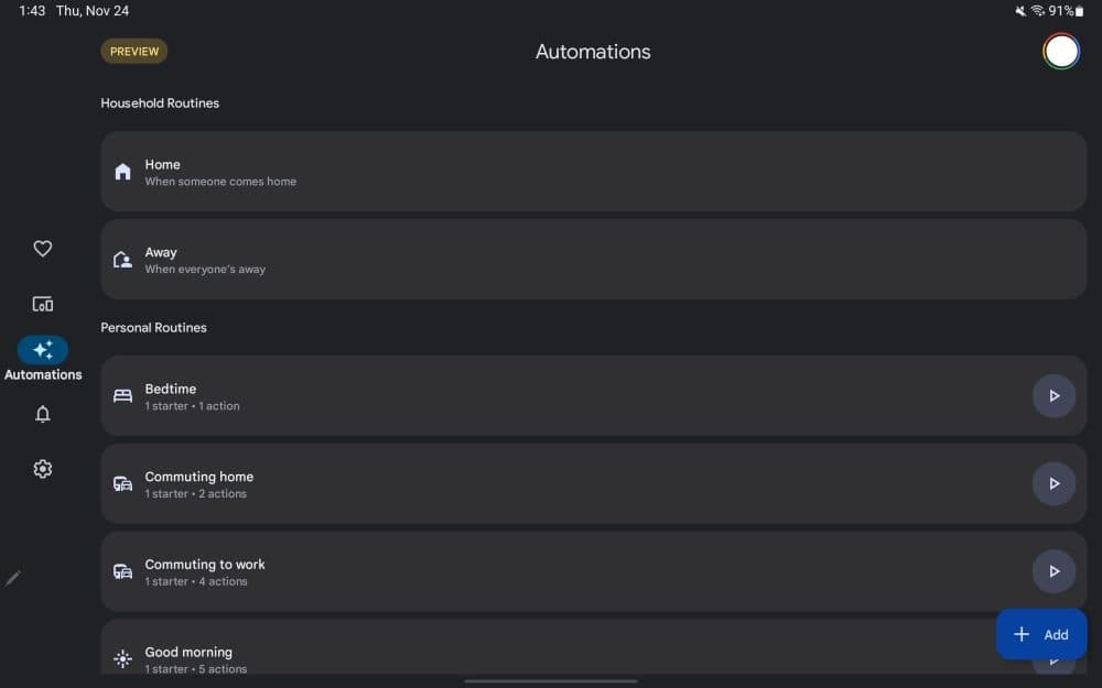 Currently in Public Preview, Google Home starts with a Material You navigation rail that makes use of pill-shaped indicators. You only see the text label of the current tab. In Favorites and Devices, Google switches to a three column layout for tiles. It’s up from two on the phone app, but a fourth would probably look fine, with such a view used by the Edit/Add favorites view.