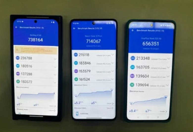 Το τηλέφωνο (2a) (πρώτο από αριστερά προς τα δεξιά) σημείωσε εντυπωσιακά 738.164 στο AnTuTu 10 με 236.788 πόντους στη δοκιμή CPU και 180.516 πόντους στο κομμάτι της GPU. Η λίστα αποκαλύπτει επίσης βαθμολογία 137.288 στο τμήμα μνήμης και 183.572 πόντους στο τμήμα UX. Με βάση τις τελευταίες