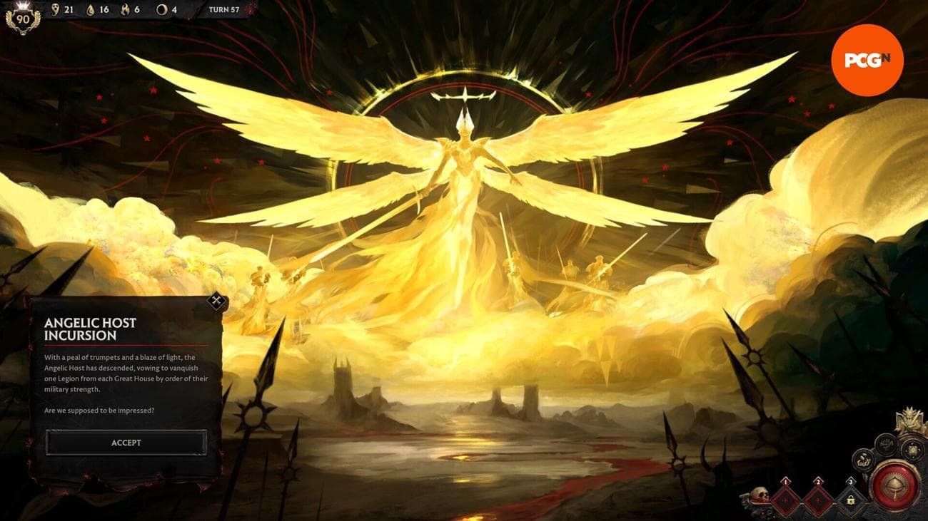 For example, I’m playing as Andromalius, the intensely vain fallen angel possessed by their own ego. My plan is twofold. Before we begin, I choose a relic – items that provide game-long bonuses and status effects – that allows for something called ‘Power Behind The Throne.’ If I court the favor of one of my rival archfiends, make myself their vassal, and guide them to an election victory, when the Conclave proclaims them the new ruler, all of their prestige will transfer to me – they will think they’ve won, but the throne will actually become mine. None of the other archfiends know I have this relic. So, I access the diplomacy screen and send an emissary to Mammon, offering an armistice. Some turns later, Mammon insults Murmur in front of the Conclave, beginning a vendetta between them. Hoping to make Mammon my puppet, I insult Murmur also. My false solidarity seems to have the desired effect, and Mammon offers to share some of his tribute with me.