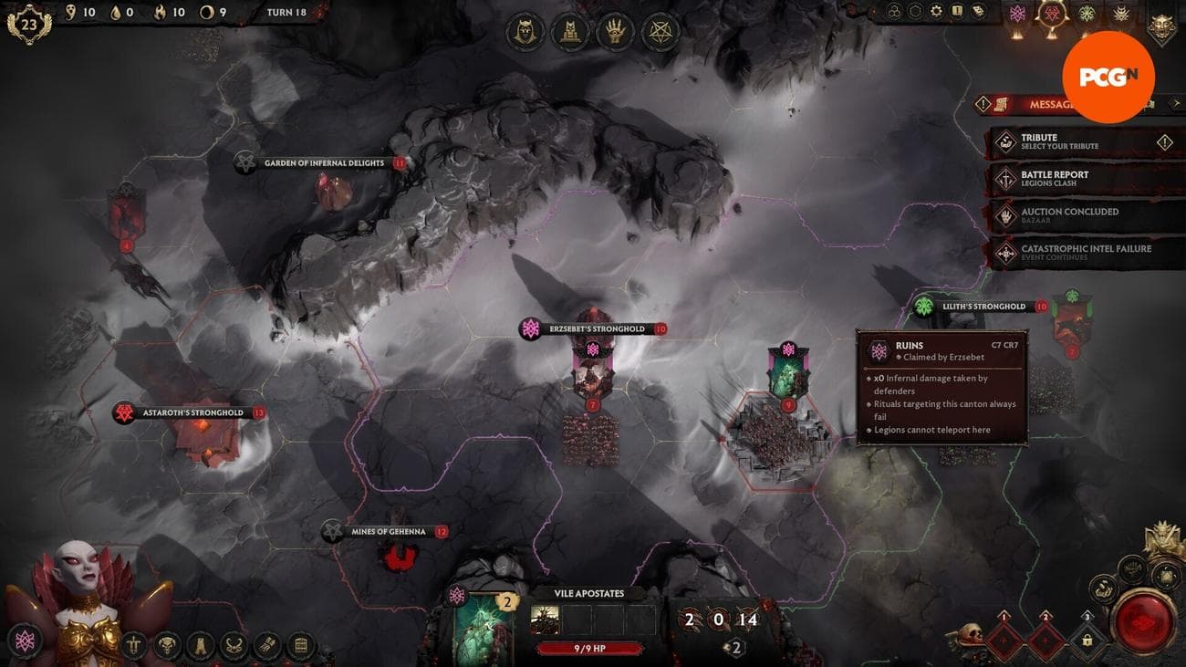 And so I begin the second part of my plan, to earn prestige by embarrassing my third rival, the ever-spiteful Erzebet. Knowing her pride, I publicly demand she pay me a handful of tribute. She refuses, and we enter a vendetta. If she destroys one of my legions in three turns, she earns a chunk of my prestige; if I destroy one of hers, I get some of her prestige. Deliberately, I have kept my armies weak. But I enter the bazaar and recruit a praetor named Eligos. In the same turn, I secretly cast a ritual which, when deployed, significantly weakens the strength of an opposing unit in combat. Predictably, Erzebet storms into my territory. Our legions line up. I summon Eligos to the frontline. And I cast my ritual. The self-proclaimed princess of Hell has fallen right into my trap. And then I’m suddenly attacked from behind, and my entire legion is destroyed in a single encounter. I forgot that I had insulted Murmur.